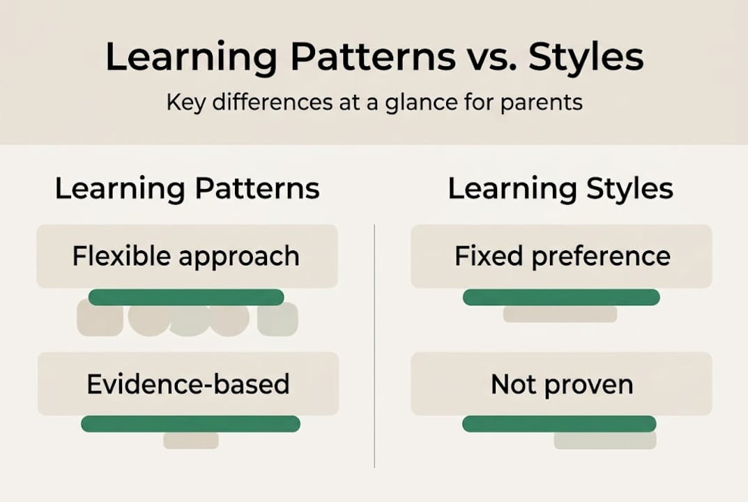 A learning pattern is a flexible, observable routine or strategy that adapts as your child grows. A learning style is a debunked fixed-preference model with no evidence for improving outcomes.