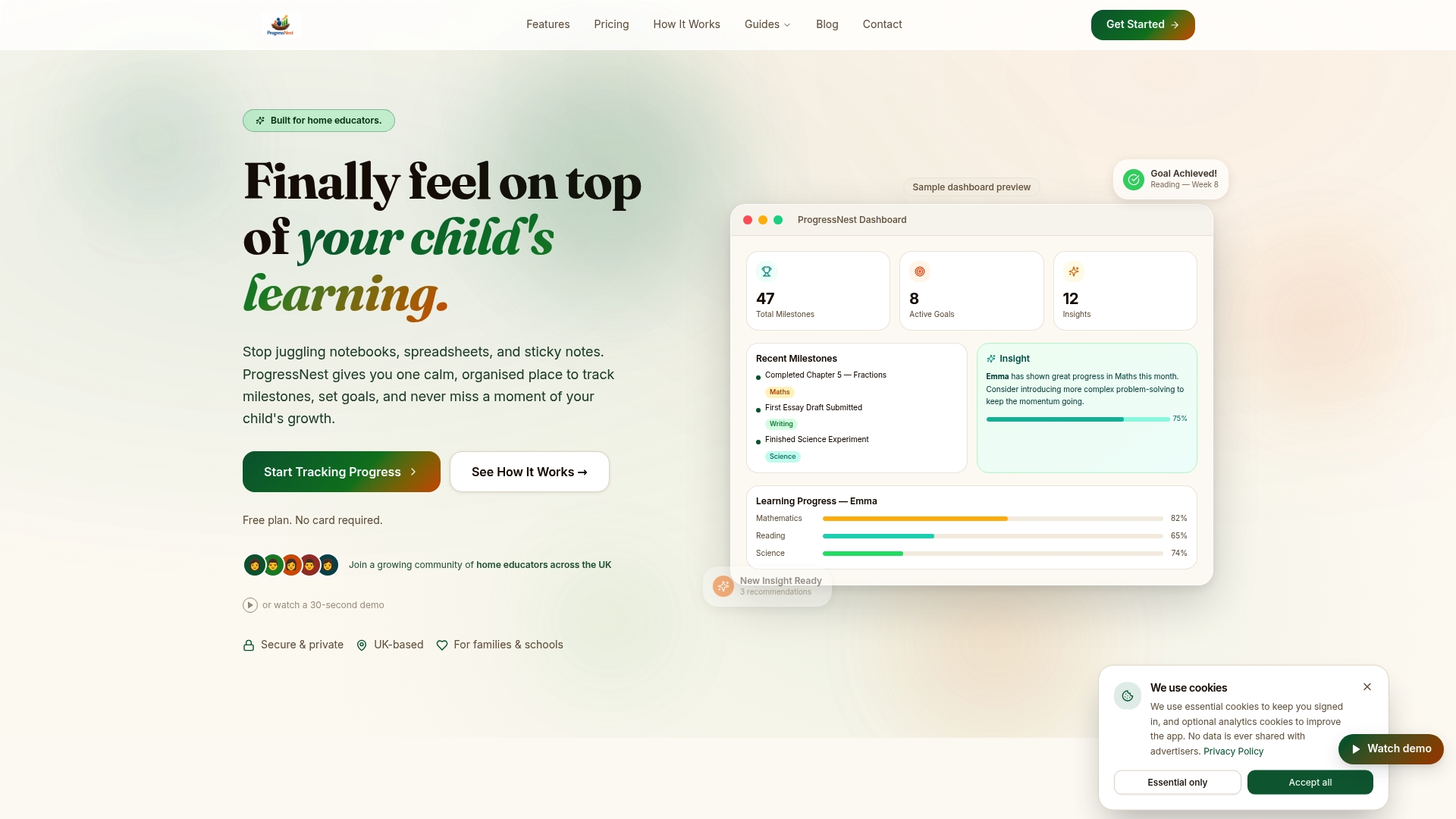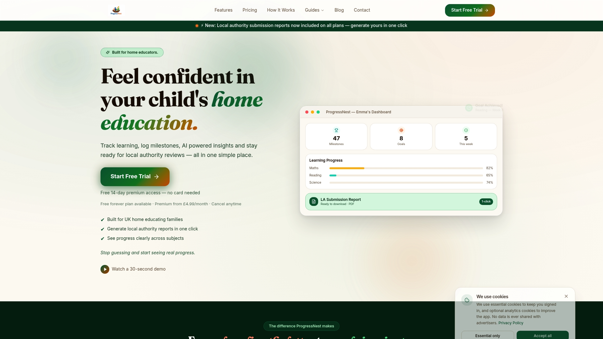 ProgressNest is a leading SaaS platform built for UK home educators to organize, monitor, and report on children’s learning progress with ease. It emphasizes ease of use, privacy, and comprehensive tracking so you spend less time on paperwork and more time teaching.